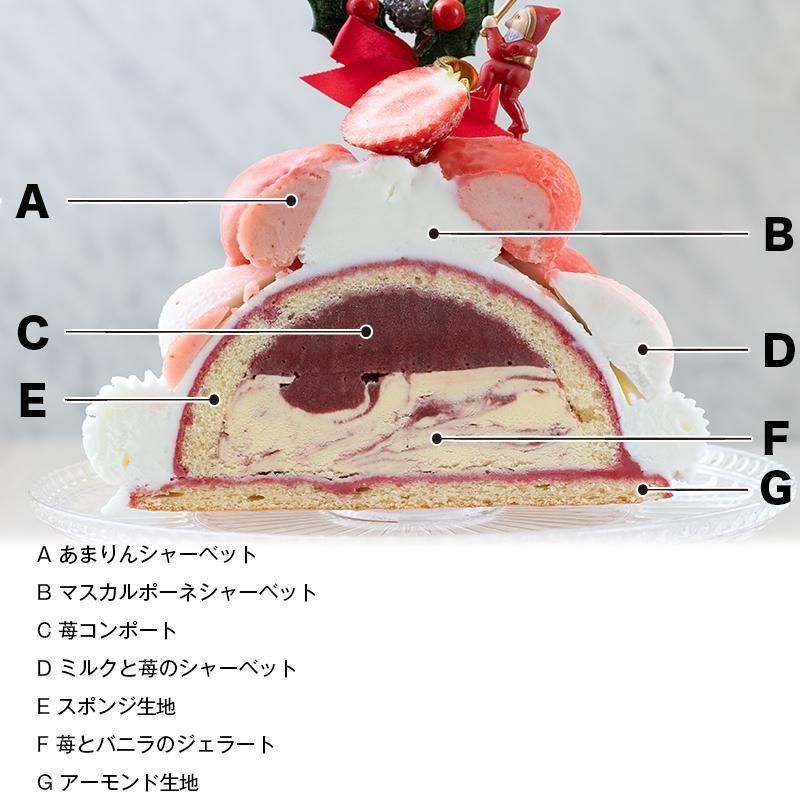 木いちごのシロップを染み込ませたアーモンド生地にバニラと苺のマーブルアイス、苺のコンポートをスポンジ生地で包み込み、マスカルポーネクリームでクリームのように絞り上げ、あまりんとあまりんミルクのシャーベットで飾り付けをしました。